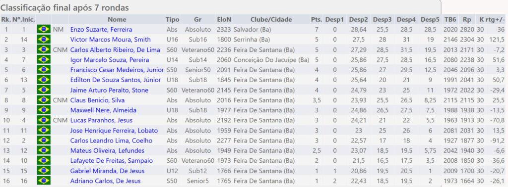 Critérios de desempate: 1. Encontro direto; 2. Buchholz médio; 3. Buchholz com corte do pior resultado; 4. Buchholz ; 5. Sonneborn Berger; 6. Média do rating dos oponentes (ARO)