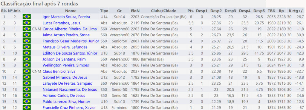 Critérios de desempate: 1. Encontro direto; 2. Buchholz médio; 3. Buchholz com corte do pior resultado; 4. Buchholz ; 5. Sonneborn Berger; 6. Média do rating dos oponentes (ARO)