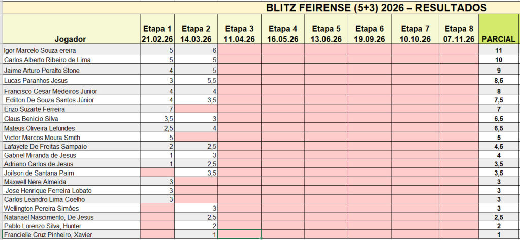 Campeonato Feirense de Xadrez Blitz (5+3) 2026 – RESULTADOS e ETAPAS Etapa 1Etapa 2 Get fit with us Compartilhar este conteúdo Abre em uma nova janela X Abre em uma nova janela Facebook Abre em uma nova janela Pinterest Abre em uma nova janela LinkedIn Você também pode gostar ABERTO LAFAYETE SAMPAIO – BLITZ (5+3) – DELAY AMERICANO 5+3 (18.01.25) 18 de janeiro de 2025 Campeonato Feirense de Xadrez Blitz (3+2) – Resultados e etapas 20 de julho de 2025 Blitz (5m + 3s) – 2026 15 de janeiro de 2026 Deixe um comentário Cancelar respostaComentárioDigite seu nome ou nome de usuário para comentar Digite seu endereço de e-mail para comentar Digite o URL do seu site (opcional) Salvar meus dados neste navegador para a próxima vez que eu comentar.