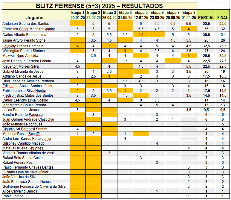 Blitz 5+3 – ETAPA 1Blitz 5+3 – ETAPA 2Blitz 5+3 – ETAPA 3Blitz 5+3 – ETAPA 4Blitz 5+3 – ETAPA 5Blitz 5+3 – ETAPA 6Blitz 5+3 – ETAPA 7Blitz 5+3 – ETAPA 8 Get fit with us Compartilhar este conteúdo Abre em uma nova janela X Abre em uma nova janela Facebook Abre em uma nova janela Pinterest Abre em uma nova janela LinkedIn Você também pode gostar Campeonato Feirense de Xadrez Rápido(10m+2s) 2025 – Etapa 9 11 de outubro de 2025 Nordestão 2025 29 de setembro de 2025 Edital de convocação (17/03/2025) 17 de março de 2025 Deixe um comentário Cancelar respostaComentárioDigite seu nome ou nome de usuário para comentar Digite seu endereço de e-mail para comentar Digite o URL do seu site (opcional) Salvar meus dados neste navegador para a próxima vez que eu comentar.